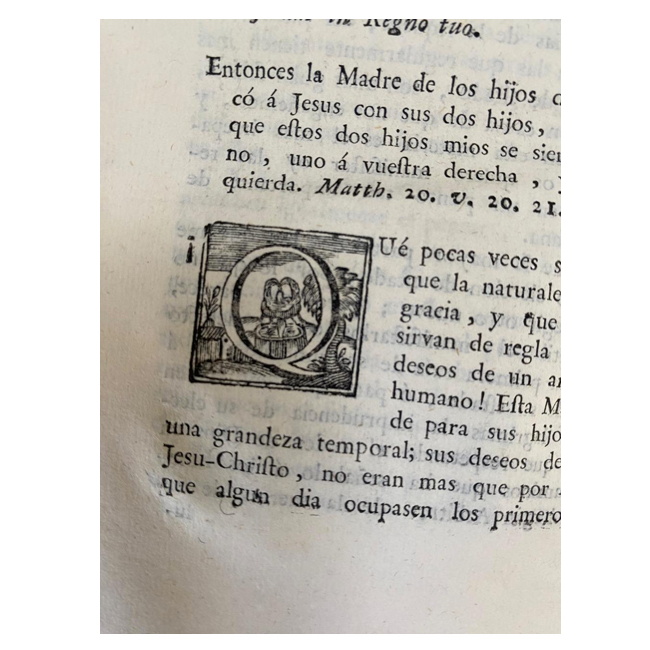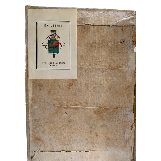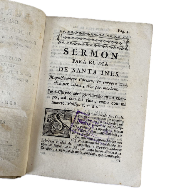 [1] h., 349 p. Título manuscrito en lomo; Rotura visible en parte central e inferior de lomo, pero encuadernación firme; marca de fuego en canto superior e inferior .Exlibris pegado en guarda anterior; Grabadito en p. de título; viñetas y capitulares ornamentales a lo largo de textos.