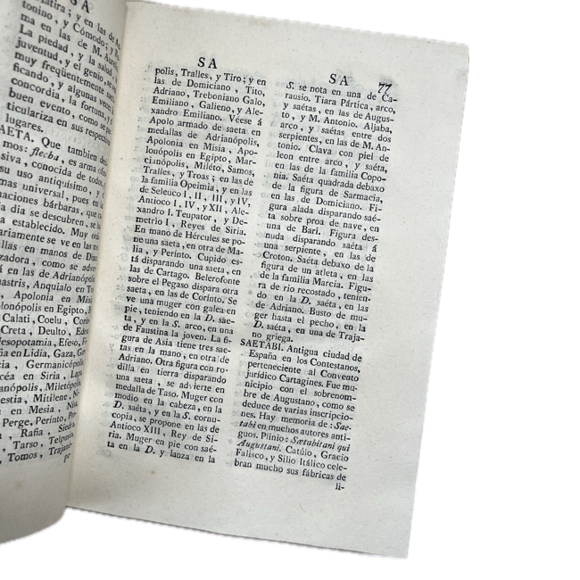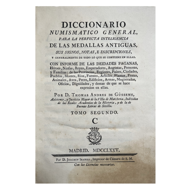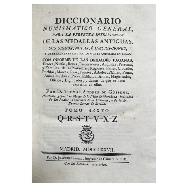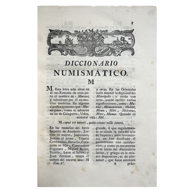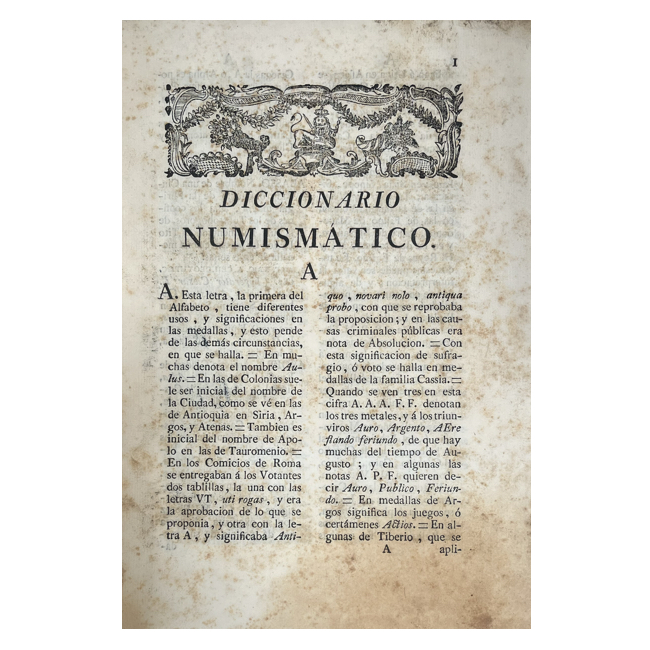 Amplio repertorio dedicado al estudio de monedas antiguas y modernas. Dispuesto en forma de diccionario, reúne voces relativas a denominaciones monetarias, metales, cecas, símbolos y leyendas de las monedas, acompañado de noticias históricas sobre reinos, ciudades y soberanos emisores.