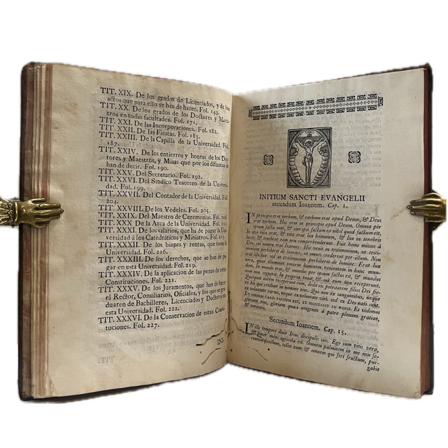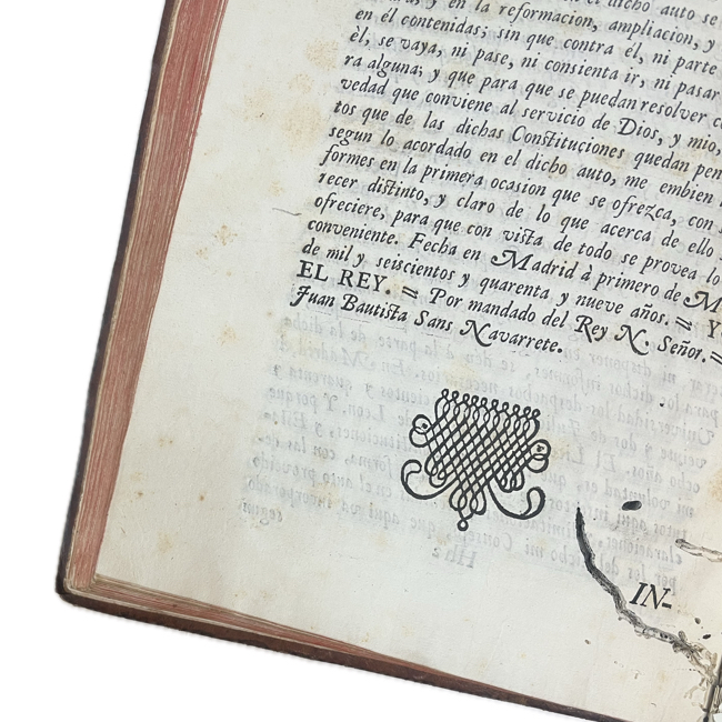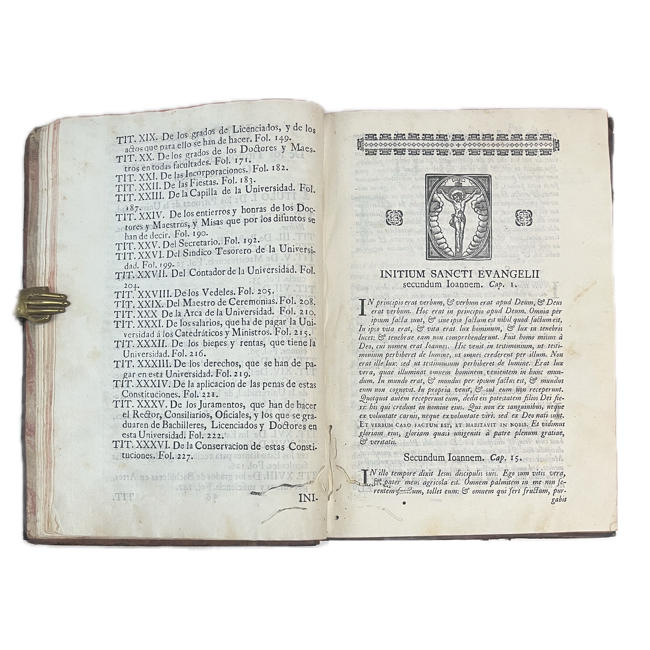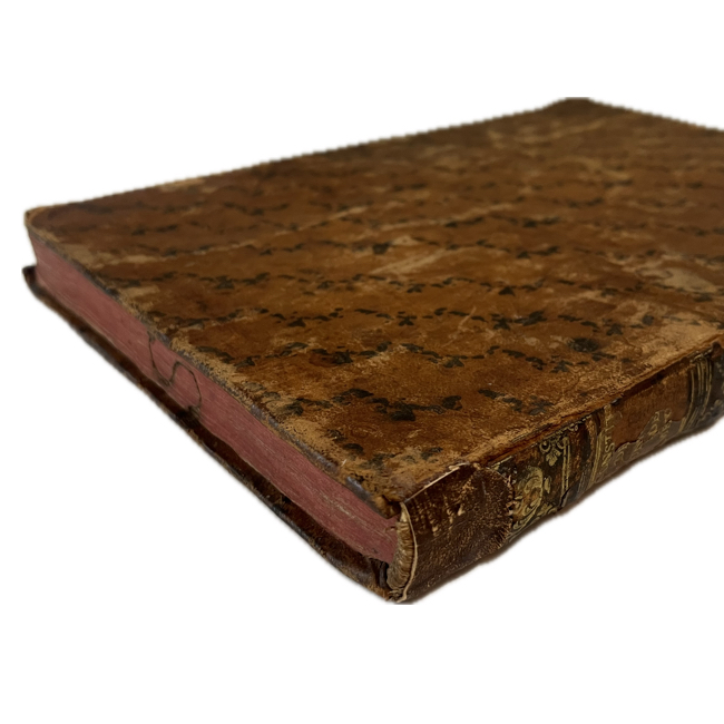 4º mayor. [16] h., 238 p., [11] h. Encuadernación mexicana en plena piel de época; cinco nervios realzados; pérdida de piel en parte superior de lomo con reparación reciente; cantos teñidos en rojo con marca de fuego sencilla en canto superior. Escudo de Carlos III en p. de título; pequeño grabado y viñeta tipográfica en h.16. Antigua anotación y tachado en p. 226; mancha de surco de polilla con mínima afectación de textos en parte inferior de primeras 10 hojas y otro en últimas 30 hojas.