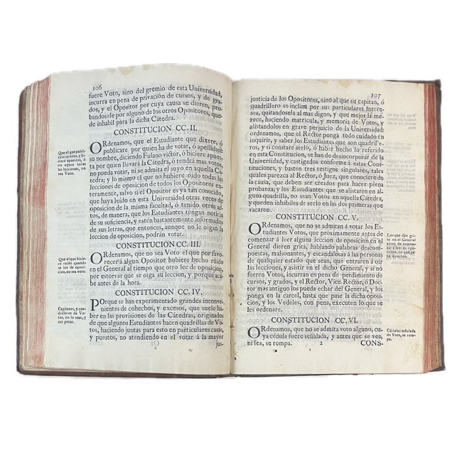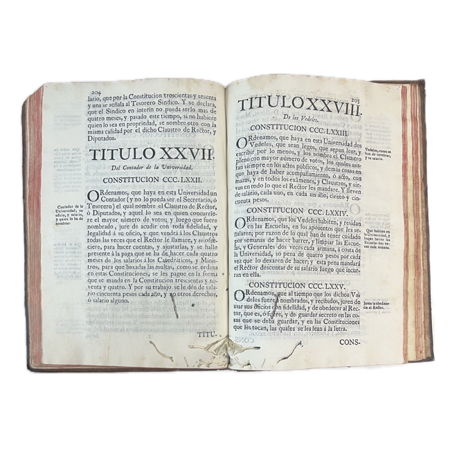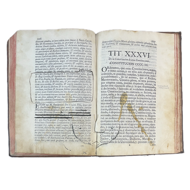 Notable edición de las constituciones de la Real y Pontificia Universidad de México. Esta segunda edición incorpora las disposiciones extendidas por Juan de Palafox y Mendoza, figura clave en la reorganización universitaria del periodo virreinal.