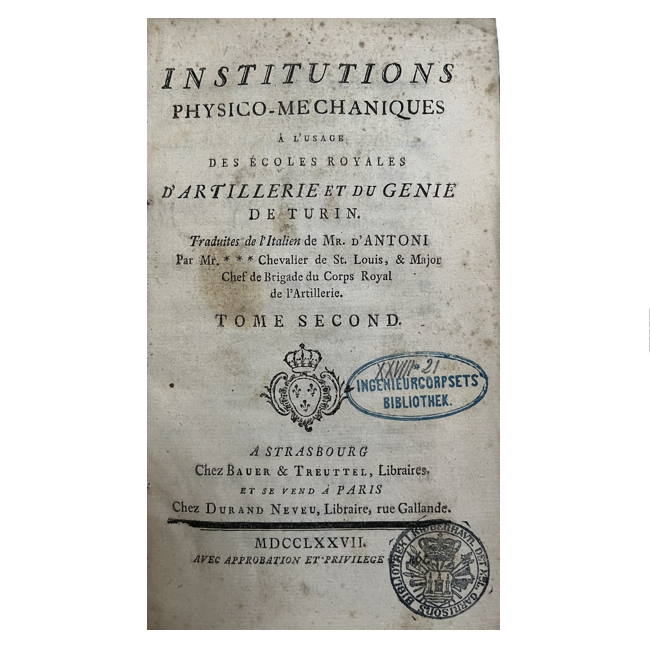 1777. d’ANTONI , Alessandro Vitorio Papacino. “Institutions Physico-Mechaniques á L’Usage des Écoles Royales D’Artillerie du genie de Turin”