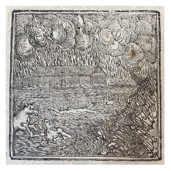 8º. 22 p. Cuadernillo sin encuadernadar, cosido en forma rústica (original o de época). Grabado xilográfico en página de título representando el arca de Noé y la inundación, en medio del desastre bíblico. El papel tiene señales de desgaste moderado: dobleces, esquinas dañadas, alguna oxidación o manchas ocasionales.