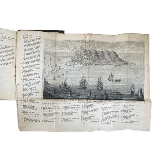 El mapa plegado – rara vez presente -, es un grabado calcográfico sobre Gibraltar, con la bahía, peñon, y explicación de la roca, grabado por Bartolomé Vazquez, “Bartl. Vazq. la grabó. M 1782”