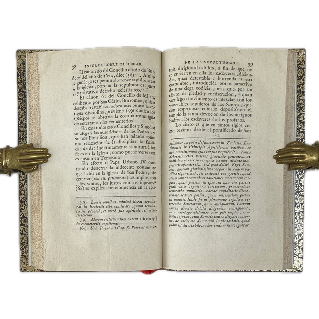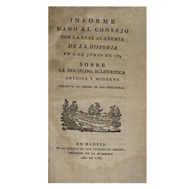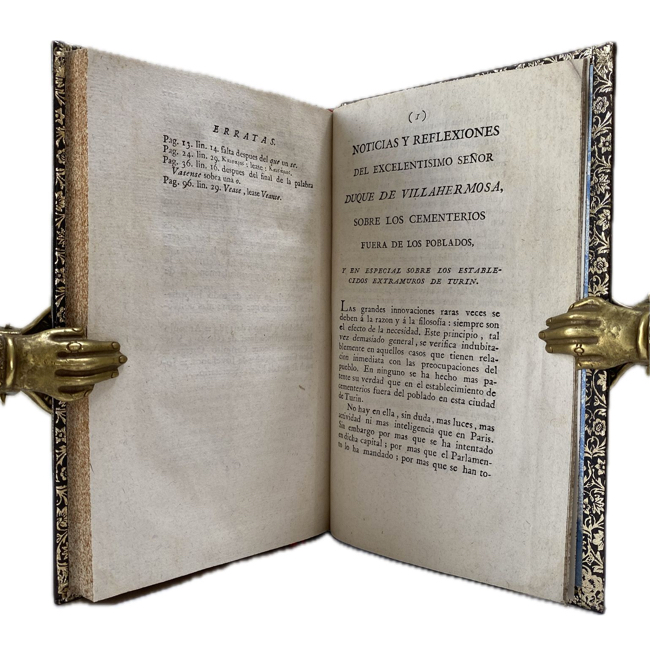 8º. [1] h., lxi, 103 p., viii. Encuadernación siglo XX en tafilete oscuro; marco ornamental en dorado en ambas tapas; tejuelos y nervios realzados en lomo; hierros dorados en bordes interiores de tapas. La portada lleva grabada una viñeta alegórica; excelente impresión sobre papel de hilo verjurado. Este ejemplar está en impecable estado, aunque se encuentra falto de las tres láminas que debía contener, cosa bastante común ya que parte de la edición quedó en rama y fue comercializada posteriormente sin incluir las láminas. Al final se han incluido estas láminas en facsímil. (Las h. de grabado calcográfico: “Delineado por Dámaso Santos Martinez. Grabado por Manuel Rodz” son un plano de las sepulturas, un plano del terreno y un alzado de las fachadas del diseño de los cementerios públicos de Turín.)