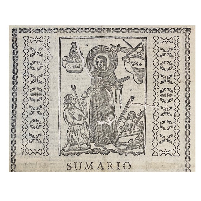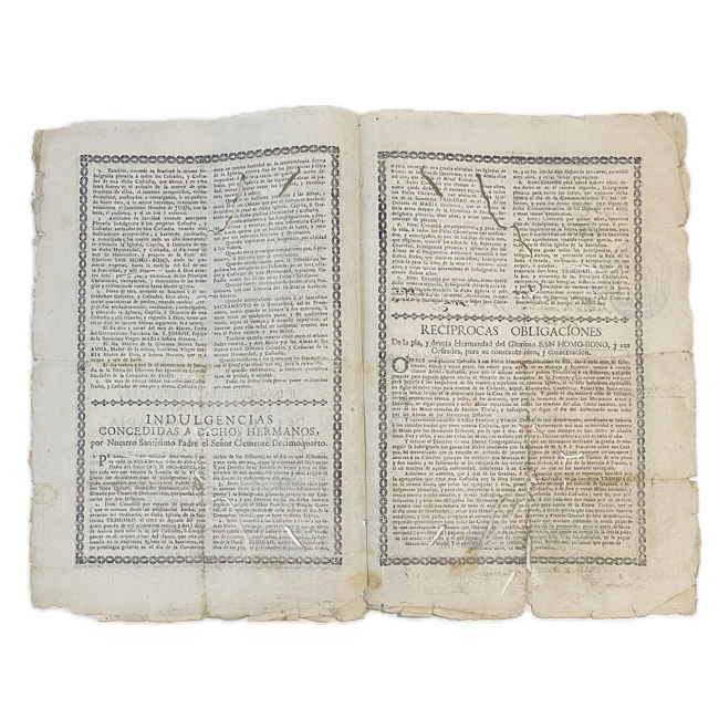 Folio menor (31 x 21 cm). 4 pp. Portada ilustrada con xilografía devocional de San Homobono, acompañado por alegorías de la Caridad y la Justicia; marco tipográfico ornamental. Surcos de polilla afectan parcialmente al documento. Firmas de Tesorero (1789), Certificación del Párroco de Santa Catalina Mártir, manuscrita (1808) y del Despacho del Colector , manuscrita (s/f); otras rúbricas al calce en última página.