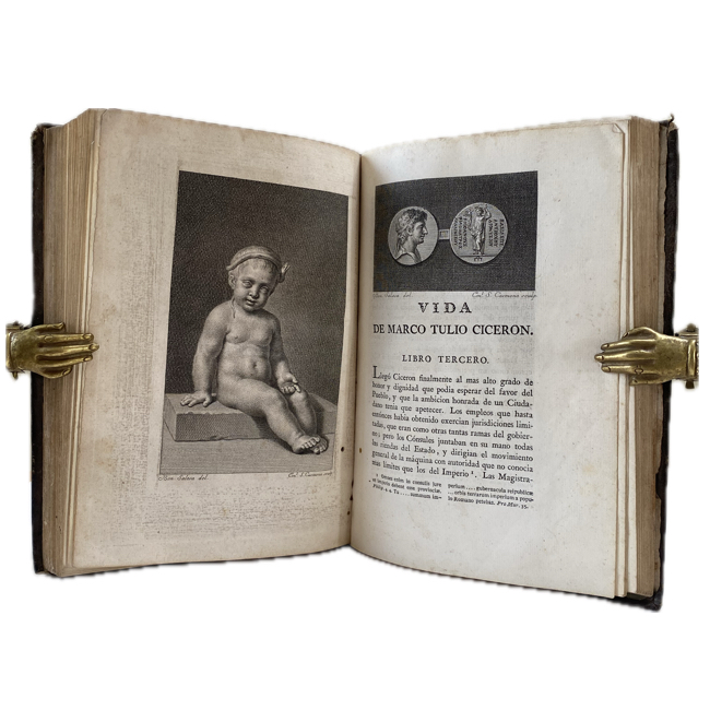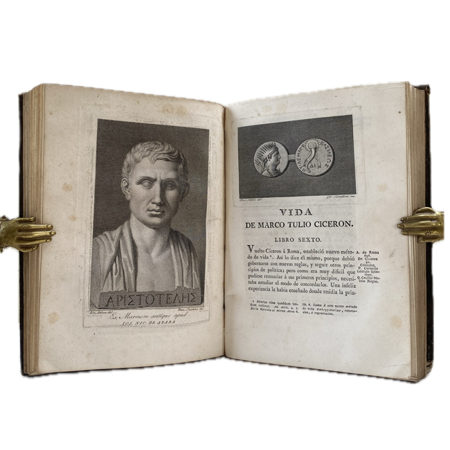 8º. 2 Tomos (de 4). Encuadernación en plena piel siglo XIX; listón dorado enmarca las tapas; tejuelos y dorados en lomos, un poco desgastados. Cada tomo contiene tres libros, con estampas en cabeceras y finales de cada libro y con un grabado de página completa a manera de frontispicio al inicio de cada libro. Bella edición en gran papel de hilo enriquecida con láminas grabadas en acero, reproduciendo bustos de personajes griegos y romanos, cabeceras y remates finamente grabadas