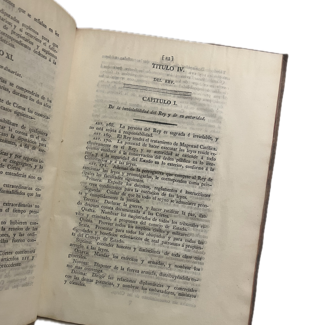 Primera reimpresión mexicana de 1812 de la Constitución de Cádiz. El texto establece la soberanía nacional en el marco de la Monarquía española de 1812, la división de poderes y la representación política. Su reimpresión mexicana de 1812, autorizada por el virrey, facilitó su circulación en la Nueva España y su recepción en el contexto político previo a los procesos de independencia.