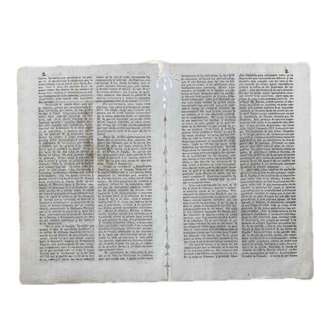 Folio menor (aprox. 31 × 21 cm). 3 números (4 p. cada uno); ejemplares completos, plegados. El num. 124 y el Num. 719, con surco de polilla marginal en parte superior, que no afecta textos. Impreso en papel de algodón hecho a mano, con filigrana visible, típico de la prensa oficial o semioficial del México temprano. La ausencia de lignina y la calidad del algodón explican que se haya conservado tan bien.