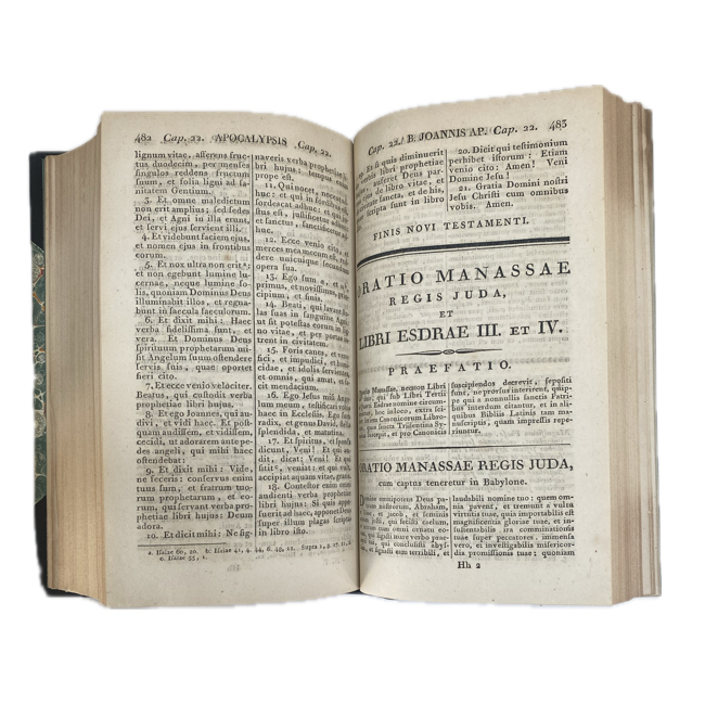Tras el Apocalipsis, y con numeración continua, se incluyen la Oratio Manasse Regis Juda y los Libri Esdrae III et IV, impresos como apéndice tradicional de la Vulgata latina, conforme al uso editorial histórico, sin integrarse en el canon del Nuevo Testamento.