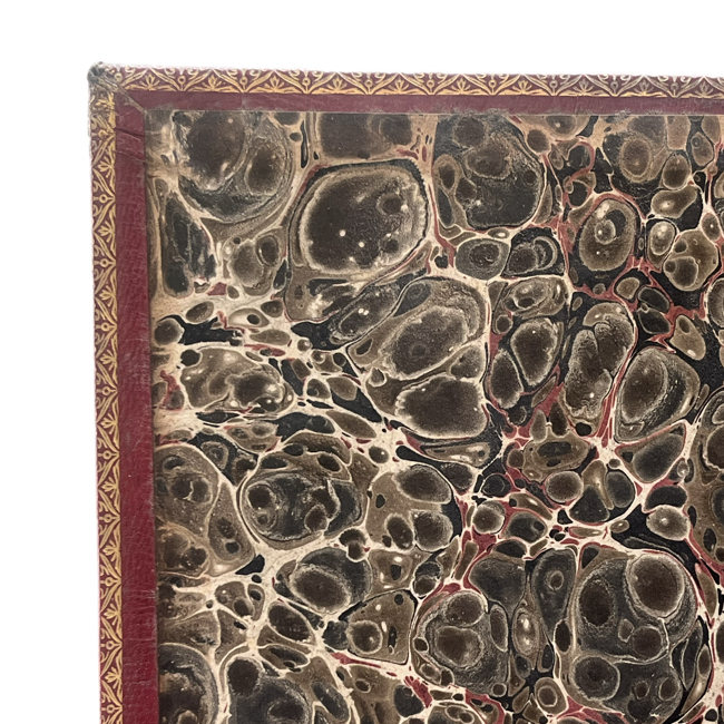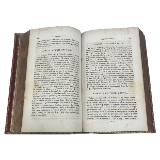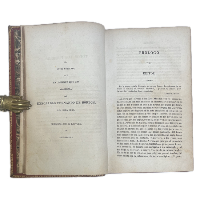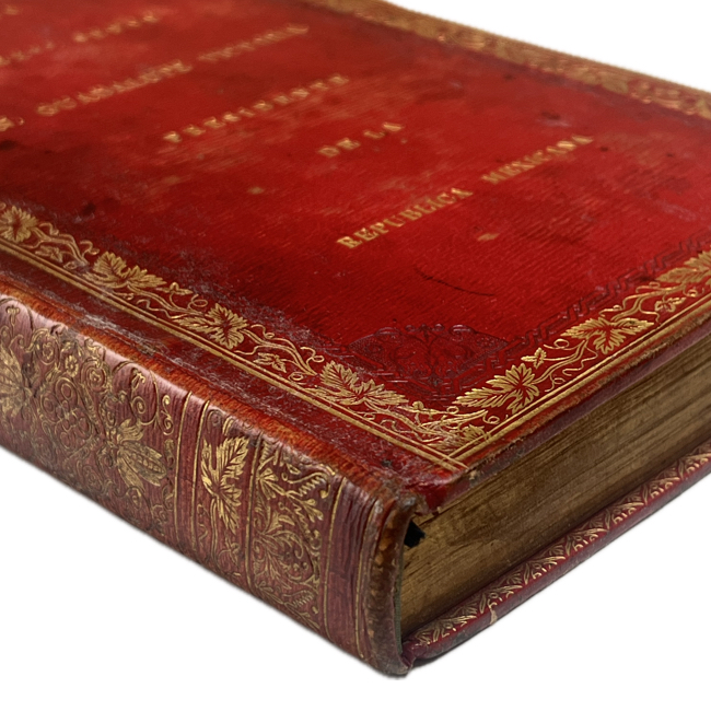 8º. 341 p. [1] h. Preciosa encuadernación de época en plena piel color burgundy; marco con fierro y listón dorados adornan las tapas, junto con marco ornamental gofrado; lomo cuajado; fierro dorado en marcos interiores; cantos dorados; dedicatoria grabada con pan de oro en tapa frontal: “Para el Exmo Señor Dn. Guadalupe Victoria, Presidente de la República Mexicana”. Guardas pintadas a mano. Frontispicio – alegoría “Inquisición española o Fernando 7º, que es lo mismo”.
