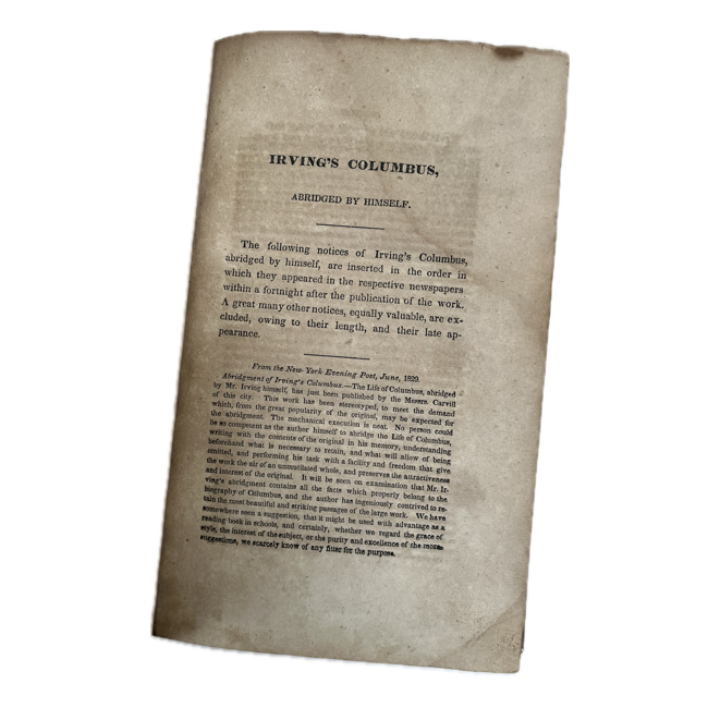 Se trata de la primera edición del compendio de Irving de su trabajo en varios volúmenes, resumido por él mismo. Designado como “Tercera edición primera en papel común” en portada.