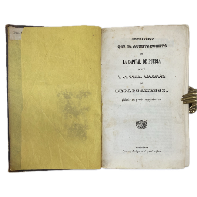 - Exposición que el Ayuntamiento de la Capital de Puebla dirije a la Exma. Asamblea del Departamento pidiendo su pronta reorganización. Imp antigua del portal de las Rosas, 1844. 15 p.