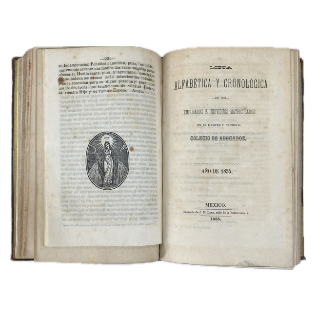 - Lista Alfabética y Cronológica de lso Empleados e Individuos matriculados en el ilustre y nacional Colegio de Abogados. Año de 1855. México, Imprenta de J.M. Lara, 1855. 116 p.