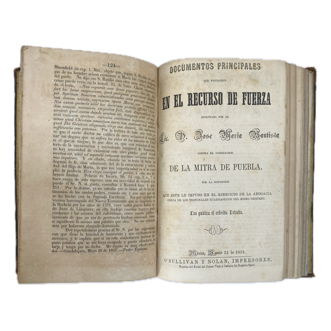 - Documentos principales que figuraron en el recurso de la fuerza intentado por el Lic. D José María Bautista contra el Gobernador de la Mitra de Puebla… México, O’Sullivan y Nolan, Impresores, 1851. 27 p.