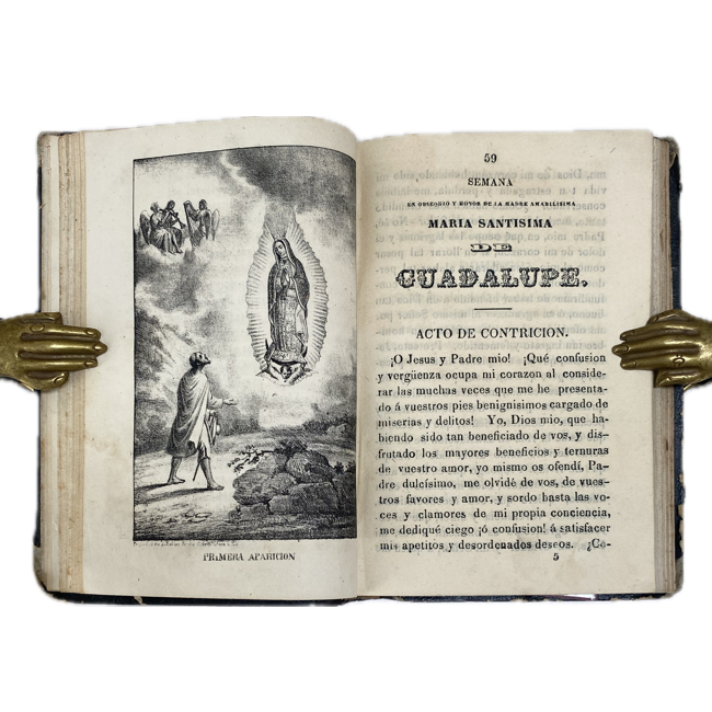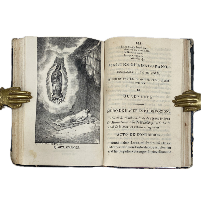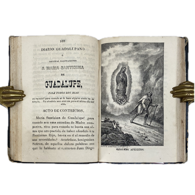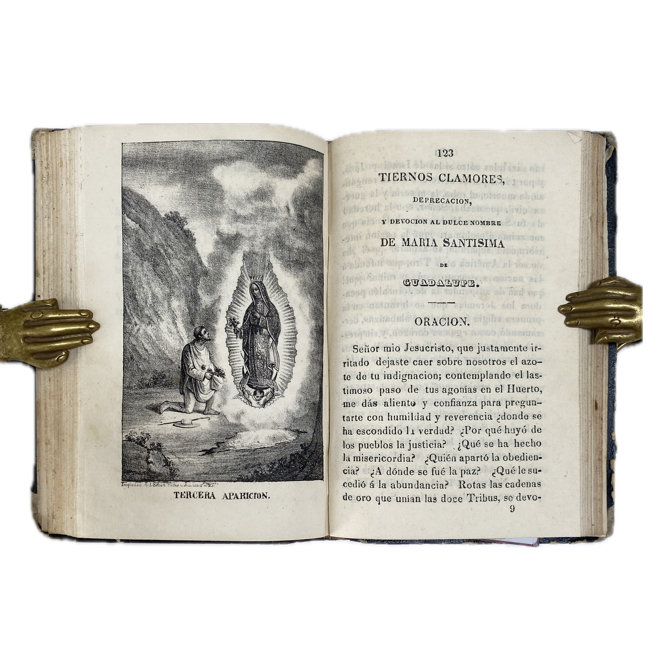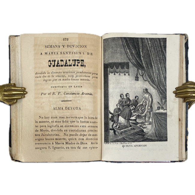 8º menor: vi, 201 p. Holandesa de época; ornamento gofrado en tapas; en general la encuadernación un tanto deslucida. Página de título presenta rotura con mínima afectación. Seis grabados de página completa fuera de numeración, incluido frontispicio, por J-S.Rocha: Virgen de Guadalupe + cinco apariciones.