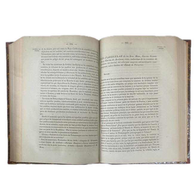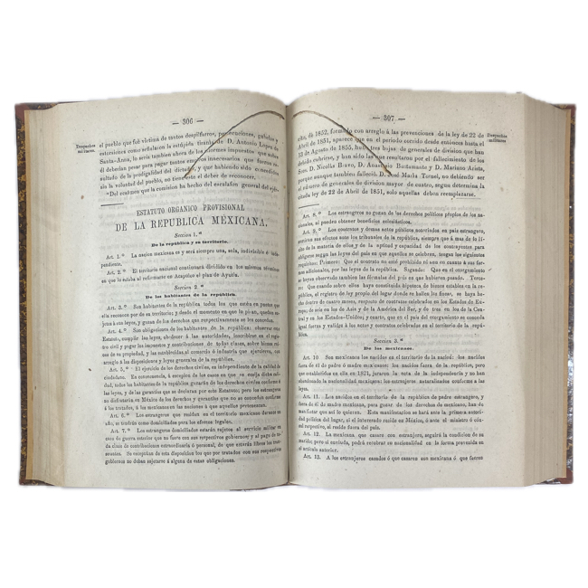 8º. Dos tomos: 876 p. + 1 h.; 1031 p. Holandesa de época; pastas marmoleadas; títulos dorados en lomos. Firmas manuscritas de antiguos propietarios en páginas de título y sellos de antiguo propietario en ambos tomos. Última hoja de Tomo II con antigua reparación de papel. Algunas manchas de óxido muy ocasionales; surcos de polilla en T.I, p.275 – 332, que no afectan lectura; por lo demás interiores muy limpios. De página 993 a 1031 un apéndice con el texto de la Constitución de 1857. Piezas: 2.
