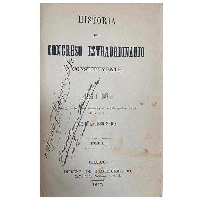 4 junio, 20251857. Zarco, Francisco. “Historia del Congreso Extraordinario Constituyente de 1856 – 1857”