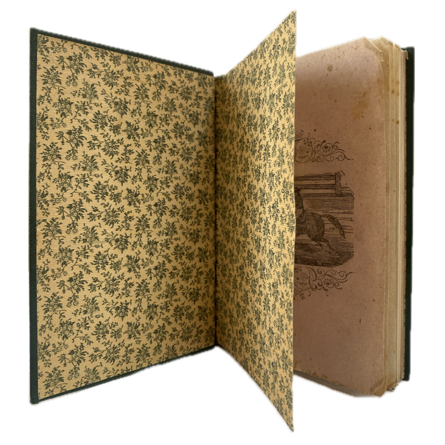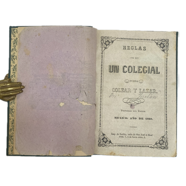 8º menor. [1] h., 64 p. Encuadernación en pasta dura color verde; título dorado al frente. Portada original en interior, con ilustración y presenta una ligera rotura. Marco ornamental en página de título; interiores bien cuidados y limpios.