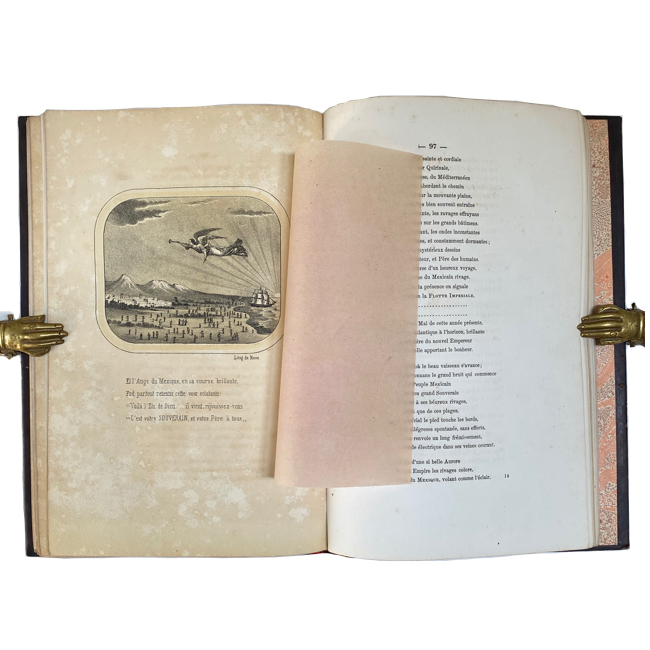 4º mayor. [1] h. 146 p. + índice. Plena piel de época en color violeta; rueda dorada enmarcando las tapas; nervios realzados y dorados en lomo. Bellas viñetas e ilustraciones acompañan los textos; 6 láminas de página completa fuera de numeración.