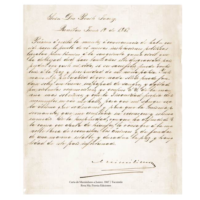 Es sin duda uno de los documentos más importantes escritos por Maximiliano fue la carta que le envió al presidente Benito Juárez el 18 de junio de 1867 en la que dice: