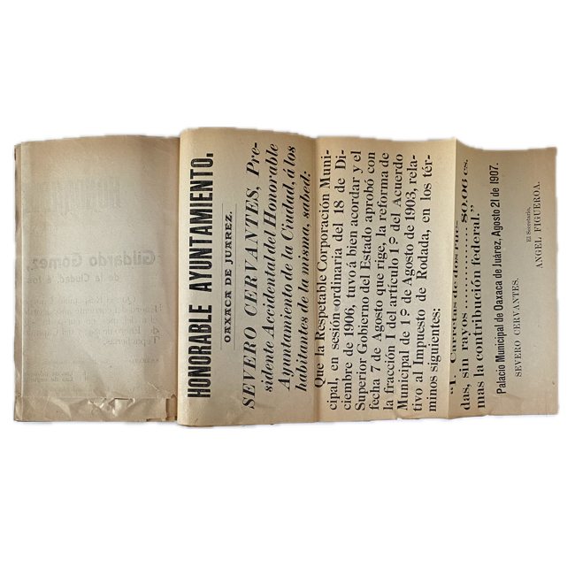 Conjunto facticio que reune más de 40 documentos oficiales impresos en Oaxaca, muchos con bandos anexos. Casi todo entre 1882 y 1911, es decir, el pleno periodo del Porfiriato y los años inmediatamente previos a la Revolución.
