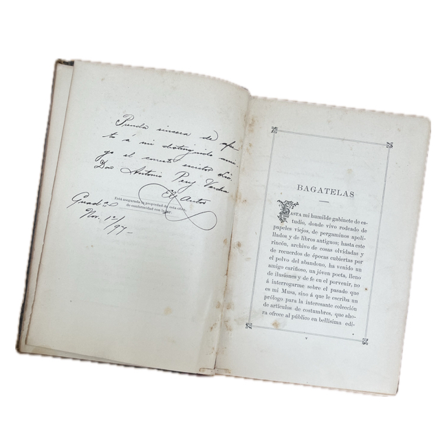 8º. xvi, 276 p. Holandesa de época; tapas presentan desgaste visible, pero la encuadernación firme; ex libris en guarda. Página de título impresa a dos tintas, dedicatoria manuscrita del autor (f. 1897). Los textos dentro de marco ornamental, manchas de óxido menores