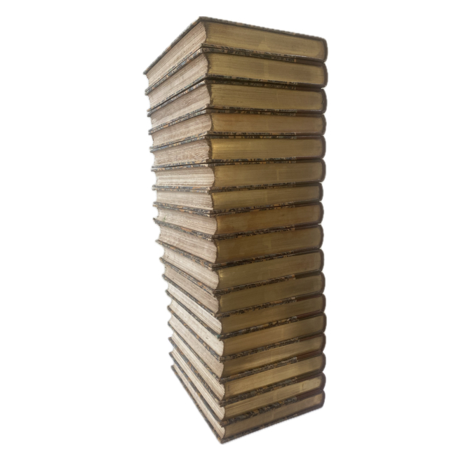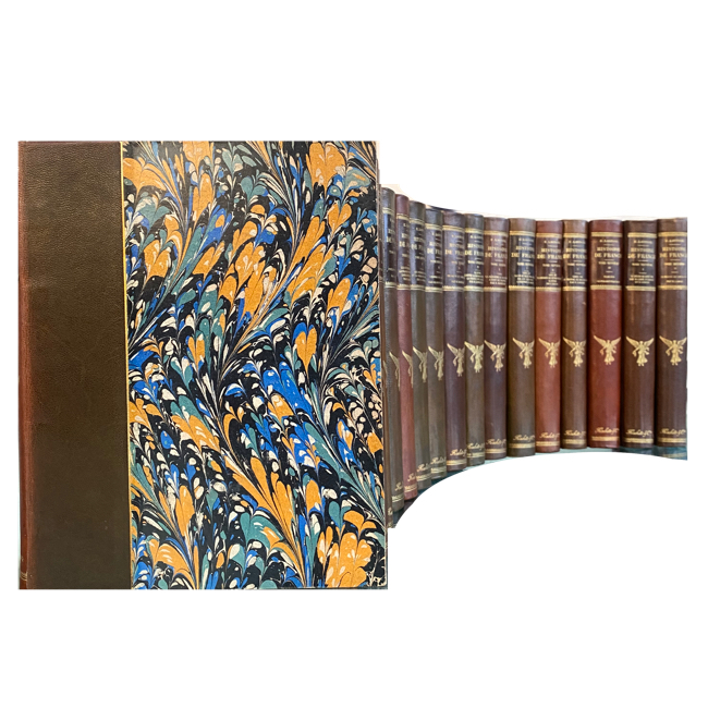 8º. Nueve tomos en 18 volumenes. Bonita y elegante encuadernación de época en media piel; pastas marmoleadas; cantos superiores dorados; tejuelos, ángel de la victoria y nombre de editor dorados en lomos; vistosas guardas en colores. Cada volumen con página de título independiente impresa a dos tintas; escudo del editor. Todos los tomos en primera edición, con excepción de Tomo I, que es 2ª edición.