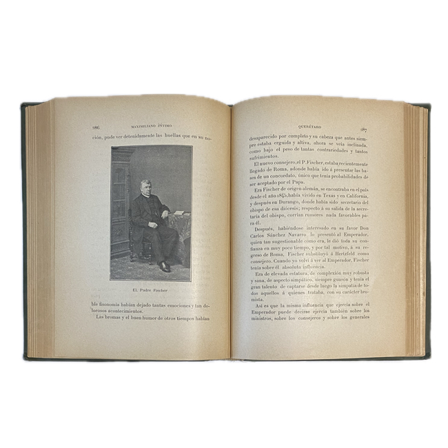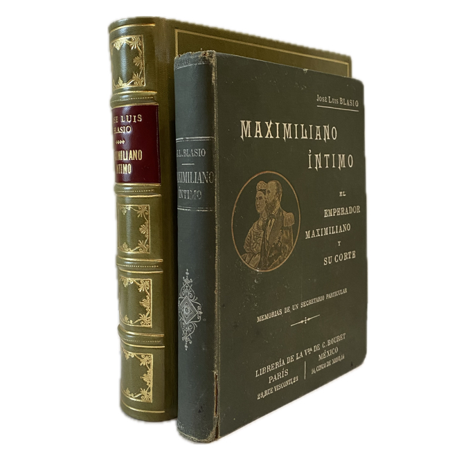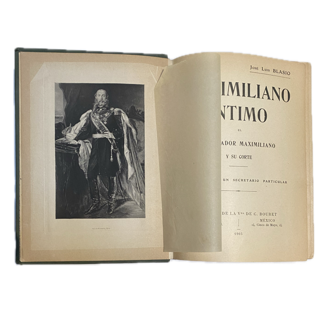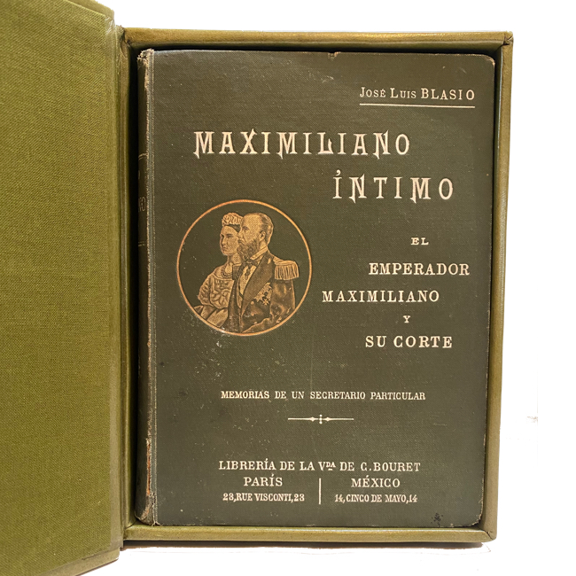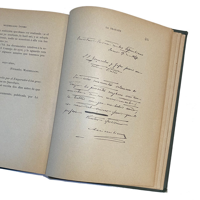 8º. 478 p. Tela editorial con dorados al frente y reverso; en lujoso estuche de piel color olivo; con águila imperial en metal al frente; tejuelo y títulos en dorado al frente. Frontispicio- retrato de Maximiliano; fotografías y facsímiles a lo largo del texto; interiores muy limpios con poca huella de uso.