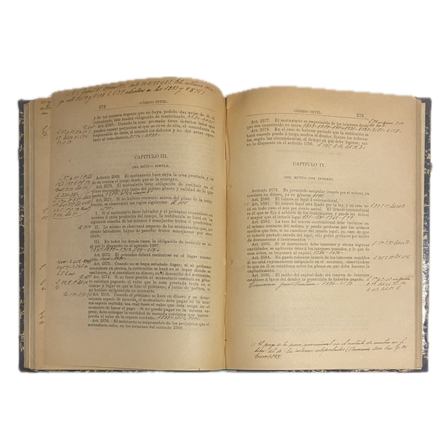 6º. [3] h., vi, 447 p. Holandesa de época, pastas marmoleadas. Sellito de antiguo propietario en primera blanca; nombre manuscrito en h2; anotaciones marginales a lo largo de textos; hoja mecanografiada a dos tintas inserta después de p.184 con texto de decreto reformando los artículos 1691, 1692 y 1866 (f. dic 1913).