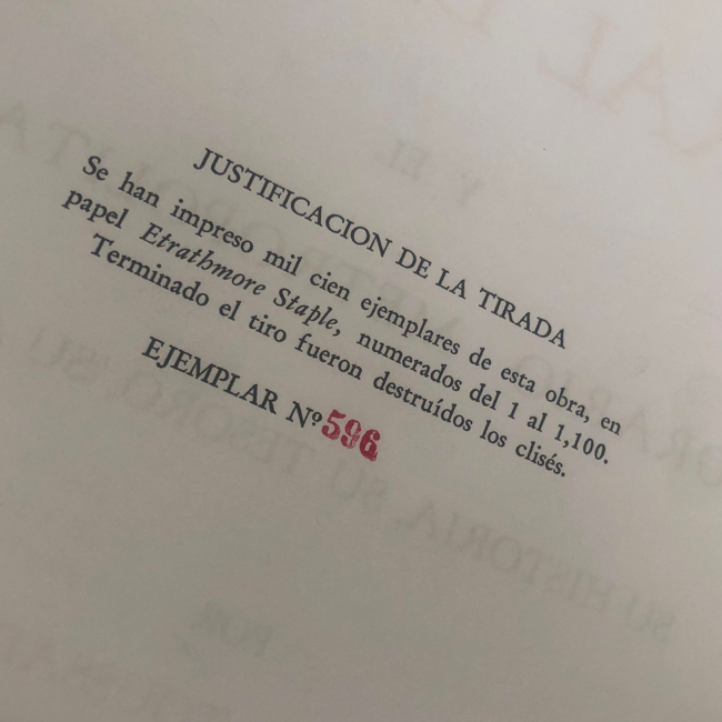 Se han impreso mil cien ejemplares de esta obra… numerados del 1 al 1,100. Terminado el tiro fueron destruidos los clisés. Ejemplar No. 596.