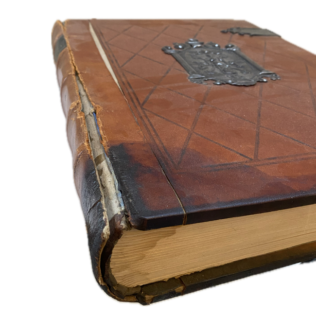 Gran folio. xxxviii, 377 p. Encuadernado en pasta dura, en piel con escudo y broches en plata. Tapa frontal ya desprendida en algunas partes y bisagras requieren refuerzo; mancha oscura en esquina inferior. Algunas hojas marcadas con humedad en esquina inferior, sin afectar textos.