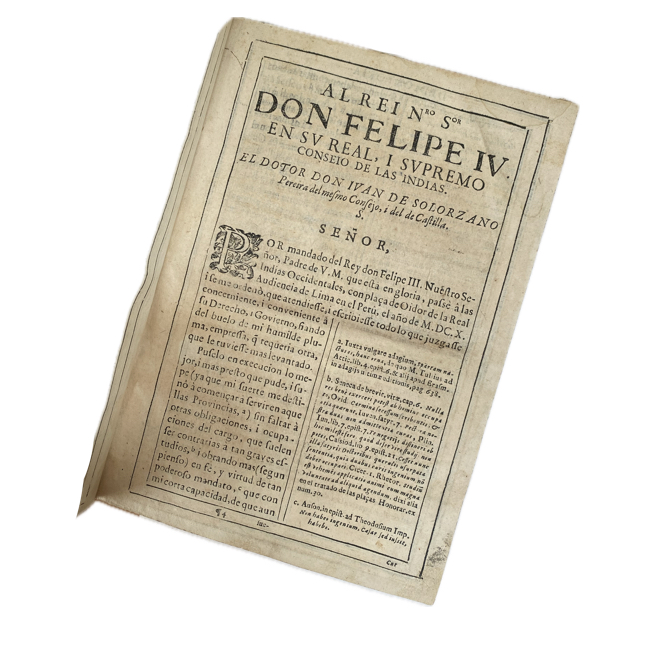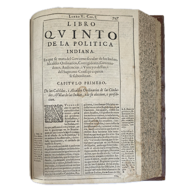 Primera edición de la obra más destacada de la jurisprudencia colonial española, un compendio de las leyes y decretos promulgados en las Indias antes del último cuarto del siglo XVII. Politica Indiana sigue ocupando y seguirá ocupando un lugar preponderante entre las obras de referencia para los estudiosos del derecho y el gobierno de las colonias españolas en América.