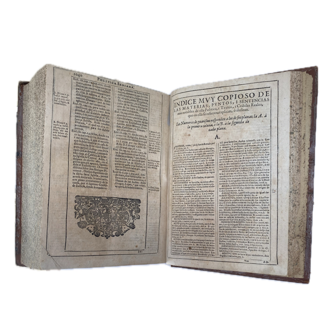 Folio. [46], 1040, [104] p. Encuadernación en piel española, siglo XIX; bisagras cansadas, han sido reforzadas, las pastas con desgaste. Faltante marginal en últimas tres hojas, con mínima afectación en texto (índice). Errores de pag., de p. 653 pasa a 656, las p. 797 y 798 se repiten. Página de título fileteada; textos a dos columnas y fileteado; apostillas marginales en latín. Falta frontispicio con grabado calcográfico y falta retrato de autor.