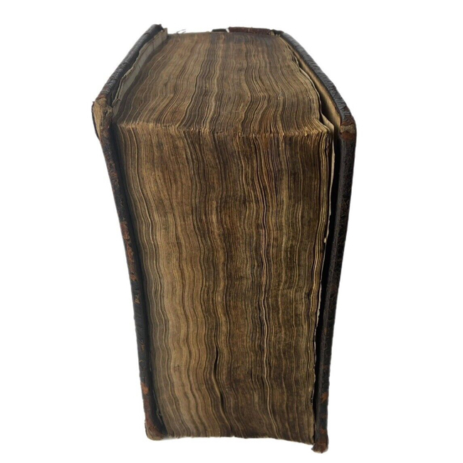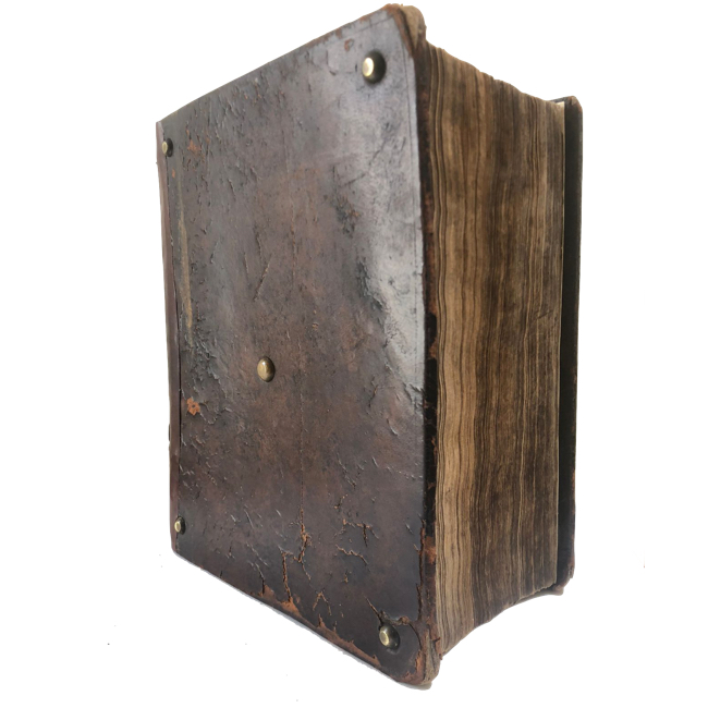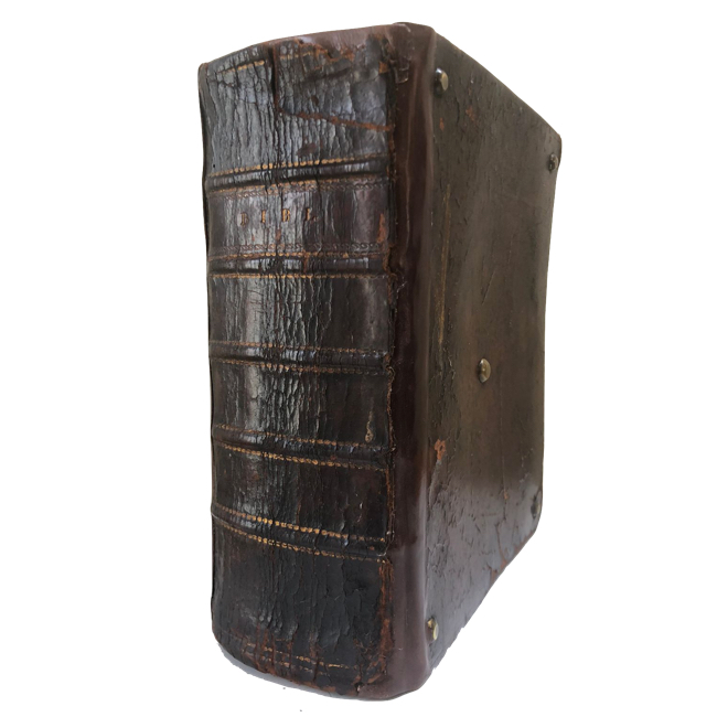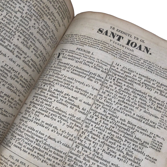 Folio (27 x 22 cm.) [(2), a1-6h4, (1), 6l2-8b4, (1), a1-n2]. Encuadernación en piel sobre tablas de madera, pequeños adornos en metal al frente y reverso; lomo gastado y agrietado al que le faltan pequeños fragmentos en la parte superior. Partes de la tira trasera despegándose. Ambas tablas están unidas sin apretar con juntas agrietadas y desgaste en las bisagras, pero ha sido reforzado en uniones y con guardas nuevas; encuadernación firme. Tableros con roces, rayones, algunas abolladuras y deformaciones menores. Desgaste en tablas y bordes con esquinas gastadas. Decoloración en los bordes de las páginas. Hojas Preliminares con inscripciones manuscritas en tinta (siglo XIX), con datos genealógicos de la familia Lloyd. Bloques de texto muy limpios; papel ligeramente tostado y manchas de óxido muy menores. Inscripción a lápiz en la guarda trasera. Idioma: Galés.