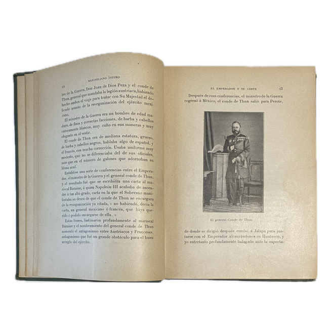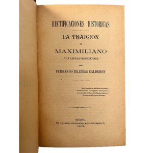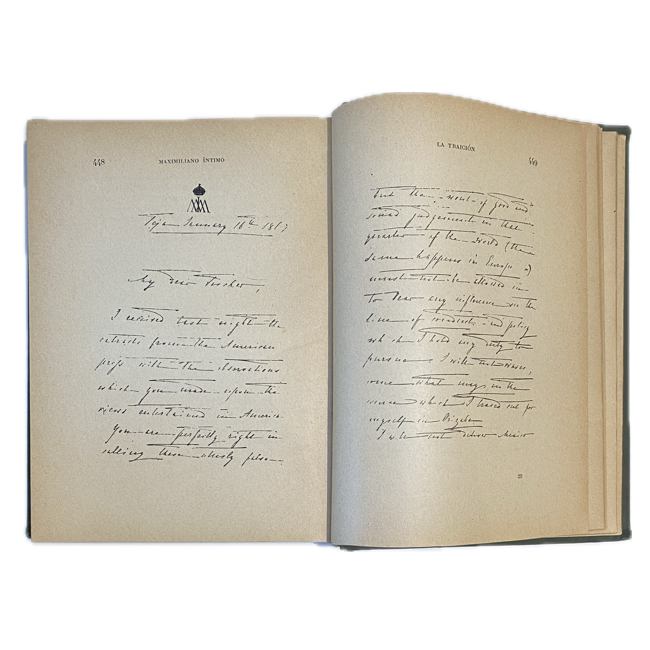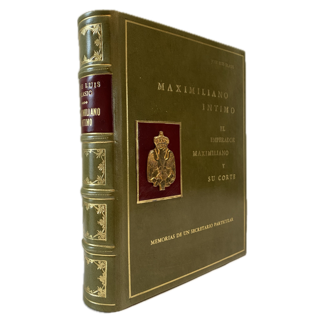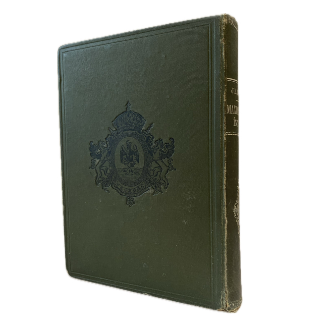8º. 478 p. Tela editorial con dorados al frente y reverso; en lujoso estuche de piel color olivo; con águila imperial en metal al frente; tejuelo y títulos en dorado al frente. Frontispicio- retrato de Maximiliano; fotografías y facsímiles a lo largo del texto; interiores muy limpios con poca huella de uso.