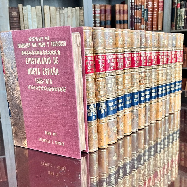 Colección de 896 documentos reunidos por Francisco del Paso y Troncoso durante su estadía en Europa, sobre todo del Archivo de Indias en Sevilla. Los documentos abarcan diversas temáticas relativas a la Nueva España: bibliografía, geografía y estadística, obras históricas y lingüística. Al morir Francisco del Paso y Troncoso en 1916, sus manuscritos originales quedaron truncos y sin publicar. Fueron traídos desde España y cedidos sus derechos para la elaboración de la presente edición. La ortogreafía de los documentos ha sido modernizada sin faltar a la fidelidad de los textos. Los índices alfabeticos de lugares, nombres y materias en el tomo final. El Epistolario comprende el periodo de los años 1505-1818. Palau: 214272.