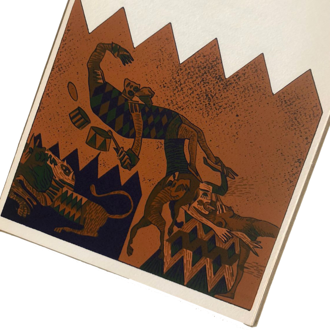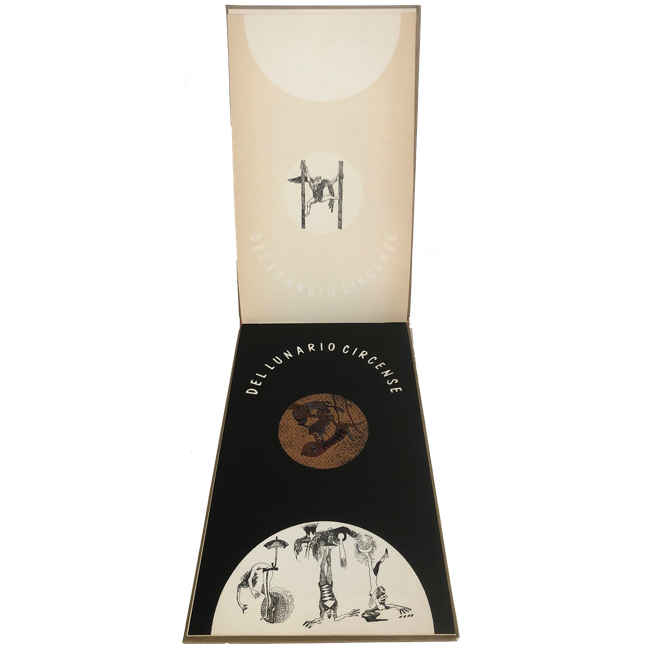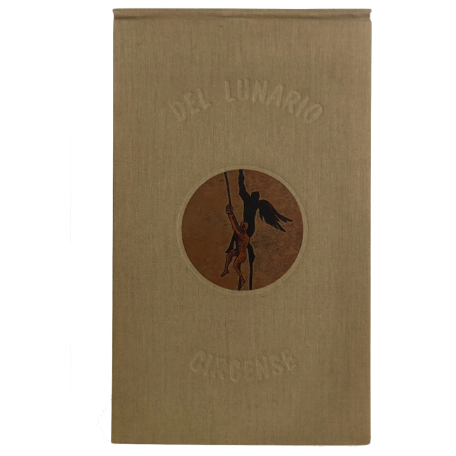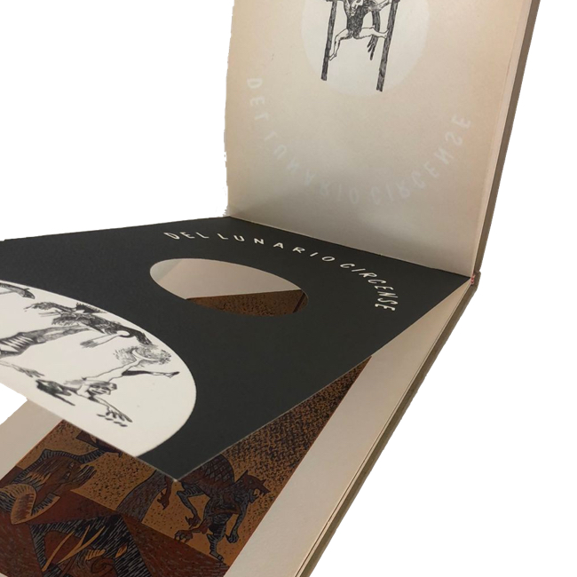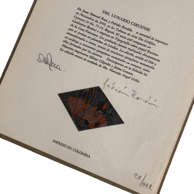 DEL LUNARIO CIRCENSE, de Juan Manuel Roca y Fabián Rendón. El texto está compuesto en caracteres Bodoni e impreso en tipografía sobre papel Rusticus de la casa Fabriano. Los grabados fueron realizados directamente por el artista en plancha de linóleo. La edición, cosida al hilo y encuadernada a mano, consta de 300 ejemplares numerados en arábigo y 300 en romano, todos ellos firmados por los autores.