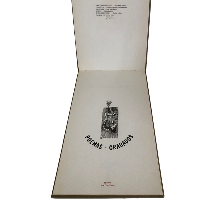 8º (en vertical) 17.5 x 30cm. 48 pp. Encuadernación rígida en tela, título grabado en seco al frente, con ilustración circular en color al centro. El libro combina poemas con motivos circenses de Roca con grabados blanco/ negro y en color de Rendón. Muy escasa edición.